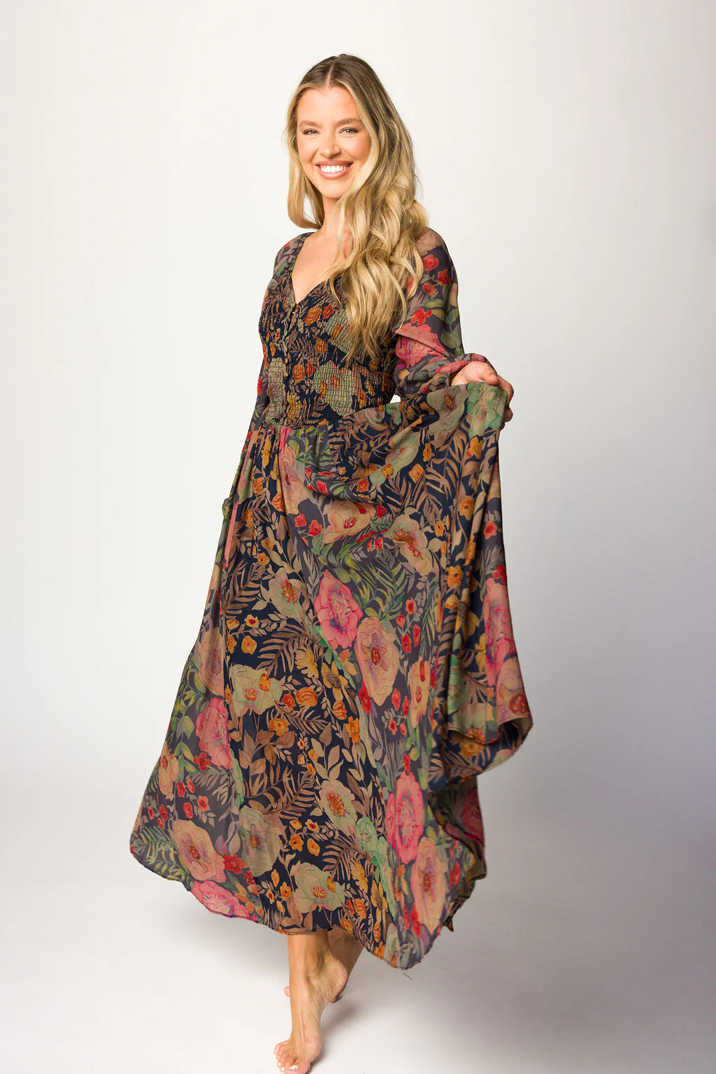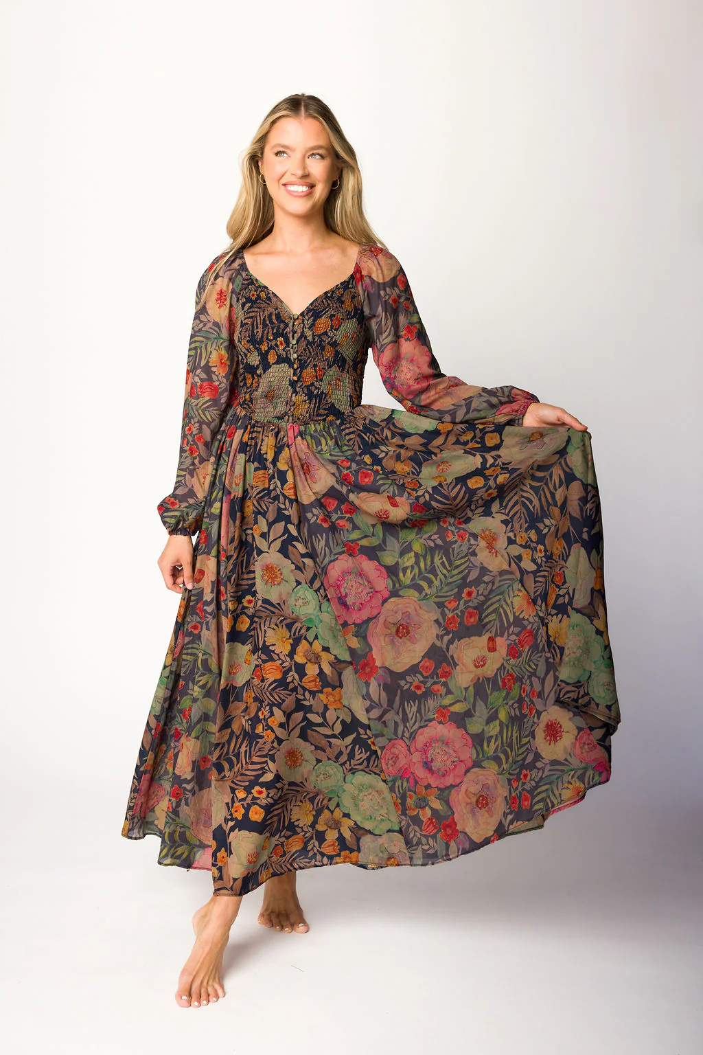 Steph Smocked Button-Front Maxi Dress in Midnight Floral